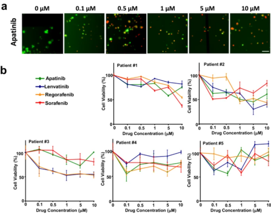 使用便携式数字微流控(DMF)系统对5例肝癌患者进行的4种临床抗癌药物的片上药物筛选结果
