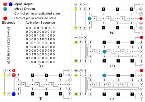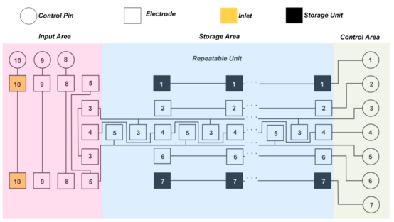 具有六个存储单元的芯片上移动液滴的示意图