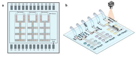(a) 同时筛选三种药物的数字微流控芯片结构示意图(b)药物筛选方案
