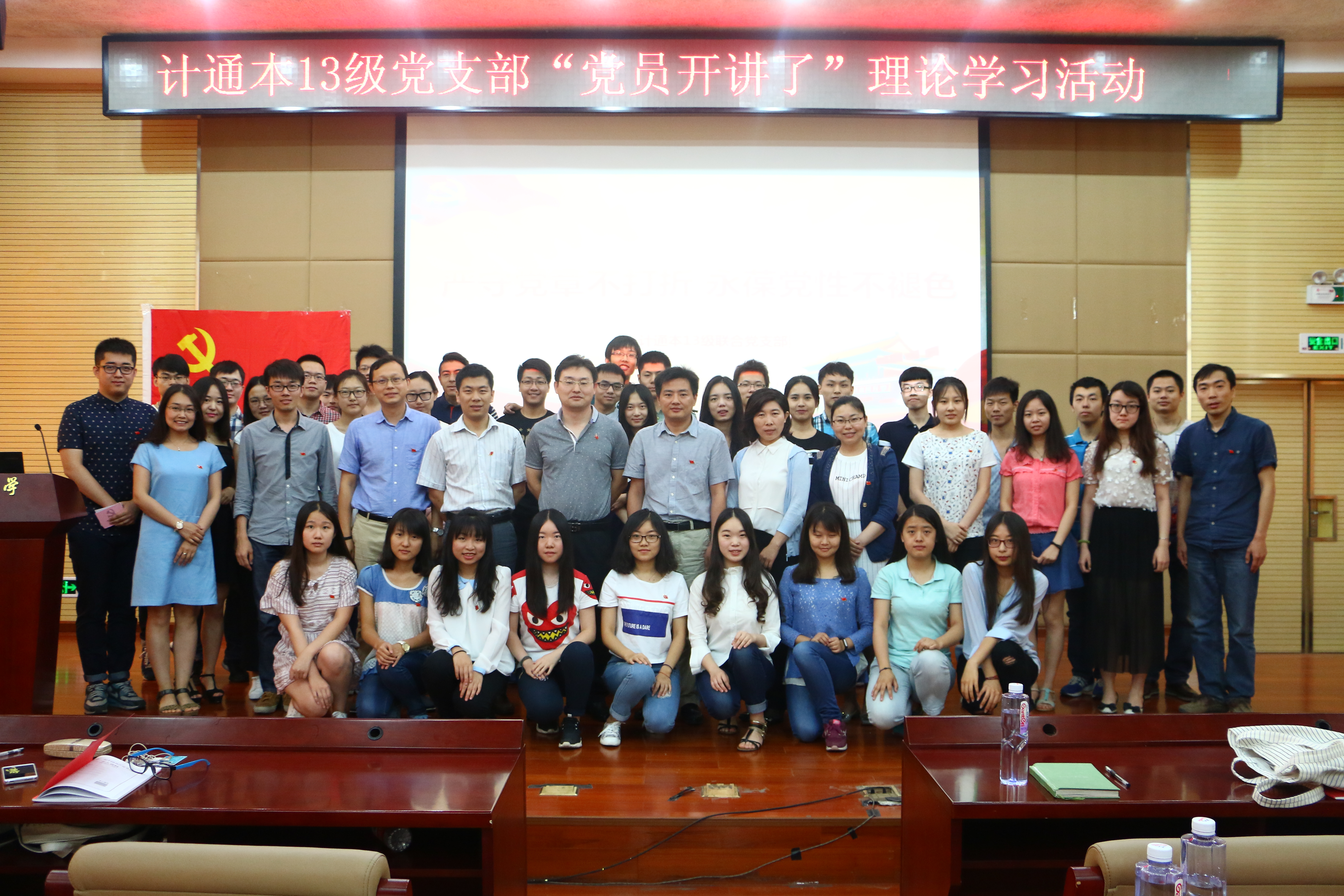 本次活动围绕“两学一做”,开展以“严守党章不打折,永葆党性不褪色”为主题的理论学习活动。活动以视频短片《“一点”解读< 中国共产党章程>》开场,带领大家共同学习了党章的主要内容。随后,主持人结合“东方之星”救援人员官东、道德标杆丛飞、人民的好公仆、党的好干部焦裕禄等优秀共产党员光荣事迹,分别从权利义务、道德风尚、奉献精神等方面对《中国共产党党章》进行了详细解读。这些先进共产党员的光荣事迹,感化着在场的每一位观众,启发大家对“廉洁奉业、勤政为民、英勇斗争、无私奉献”的深度思考,现场掌声阵阵。