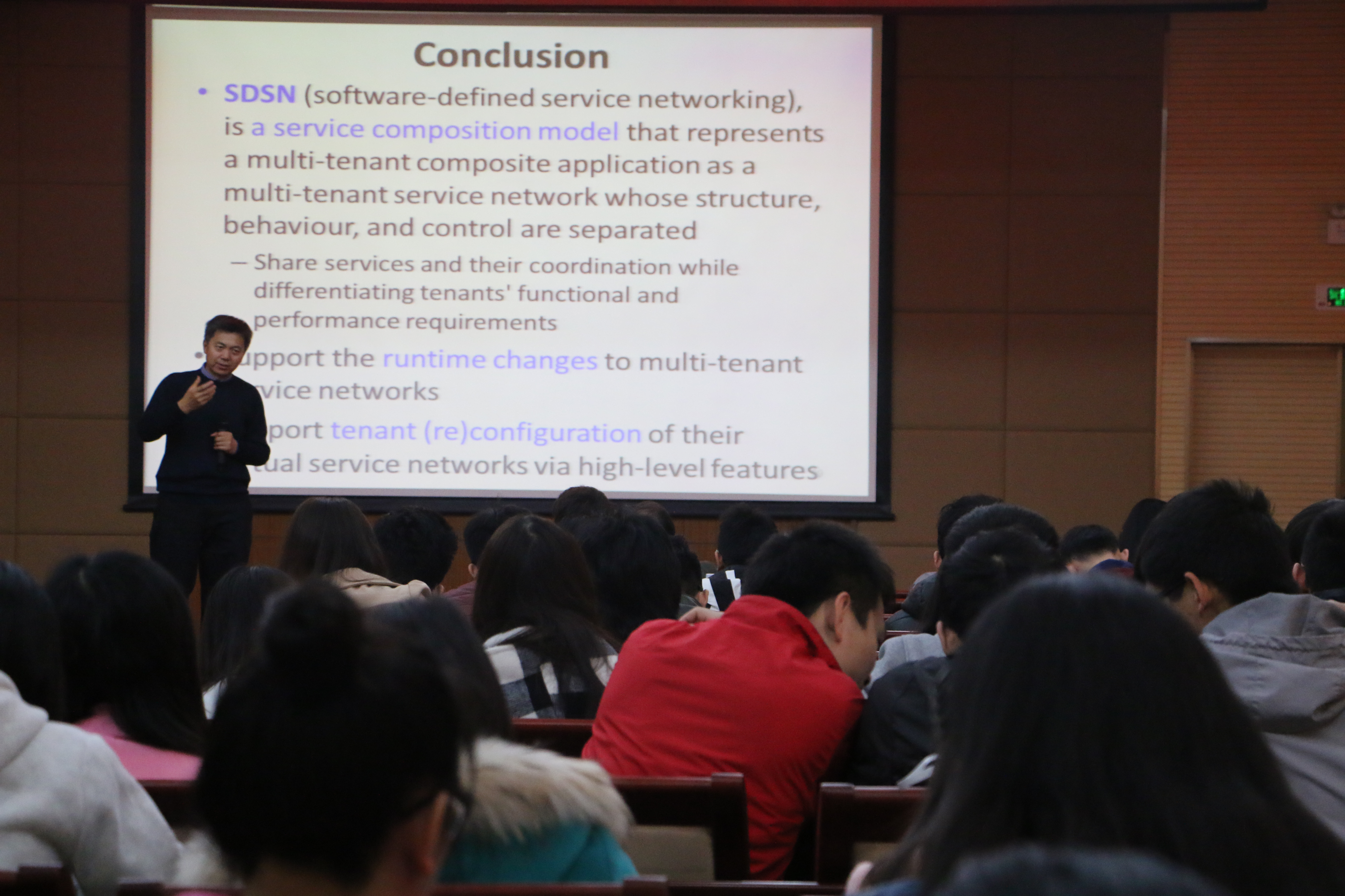 在韩教授的报告中,他首先介绍了软件定义的服务网络(Software Defined Service Network)的概念与基本原理。韩教授讲道,未来是一个可以通过网络化的云实现物联网和人联网互相交互的世界。在这种环境下,(软件)服务是普适的,这将易于集成,能够整合形成具有特定目标的新应用程序,而且能在多租户之间共享。然而,在这样一个云应用程序环境下,要实现共享服务运行时随特定租户的功能与性能的变化而变化,这具有一定的挑战性。他及其团队采用软件定义的服务网络(SDSN)来应对这一挑战问题,提出的方法通过有管理的服务网络和相关的虚拟服务网络(VSNs)实现组合式的云应用程序。研究结果表明:软件定义的服务网络是可行的,在没有引入太多运行耗时的前提下表现了良好的效果。