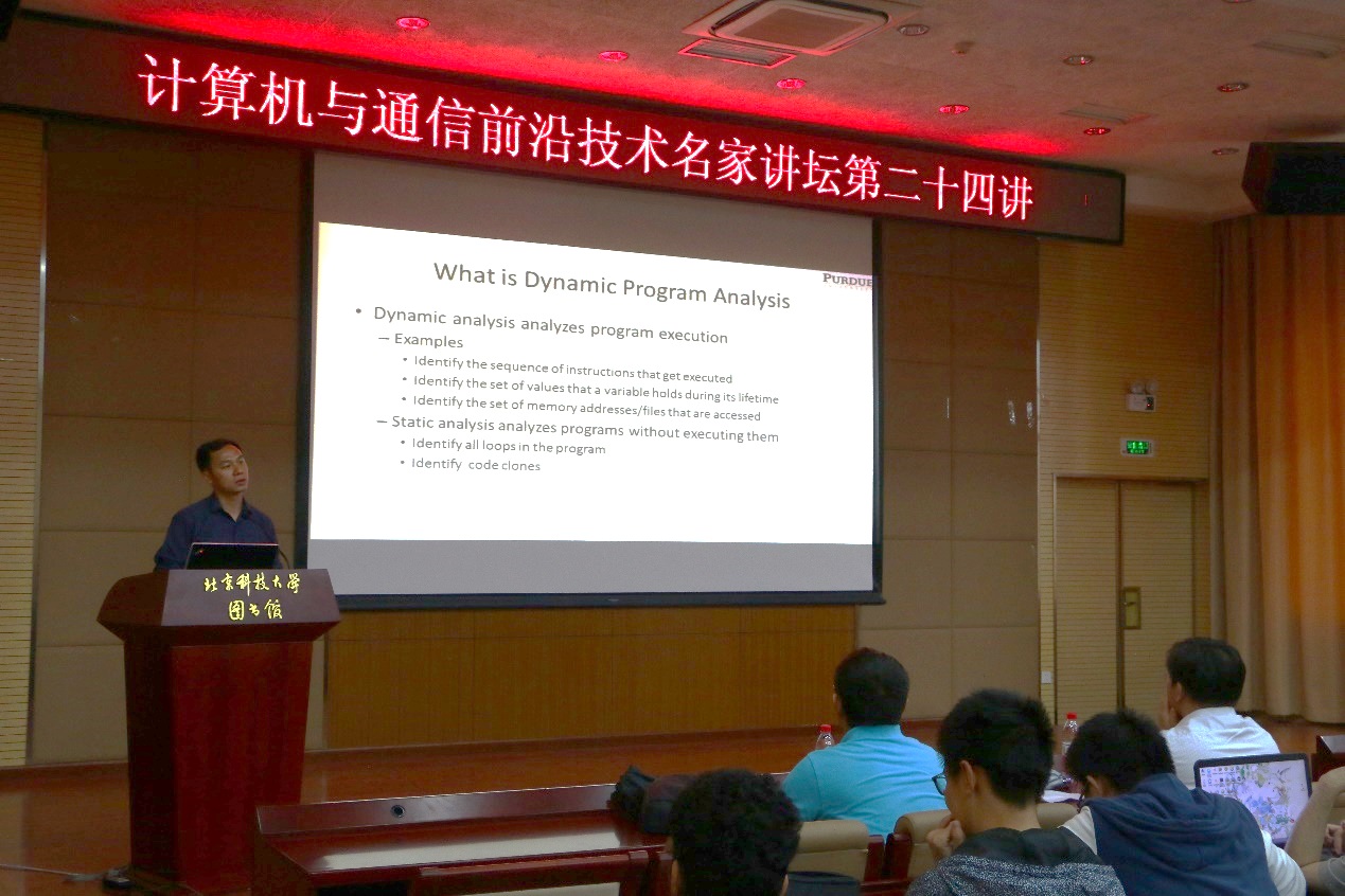6月14日下午,计算机与通信前沿技术名家讲坛第二十四讲在我校图书馆四层报告厅成功举行。此次名家讲坛,nt动漫 邀请到了美国普渡大学张翔宇教授为广大师生带来题为“动态程序分析及其应用”的精彩学术讲座。 &nbs...